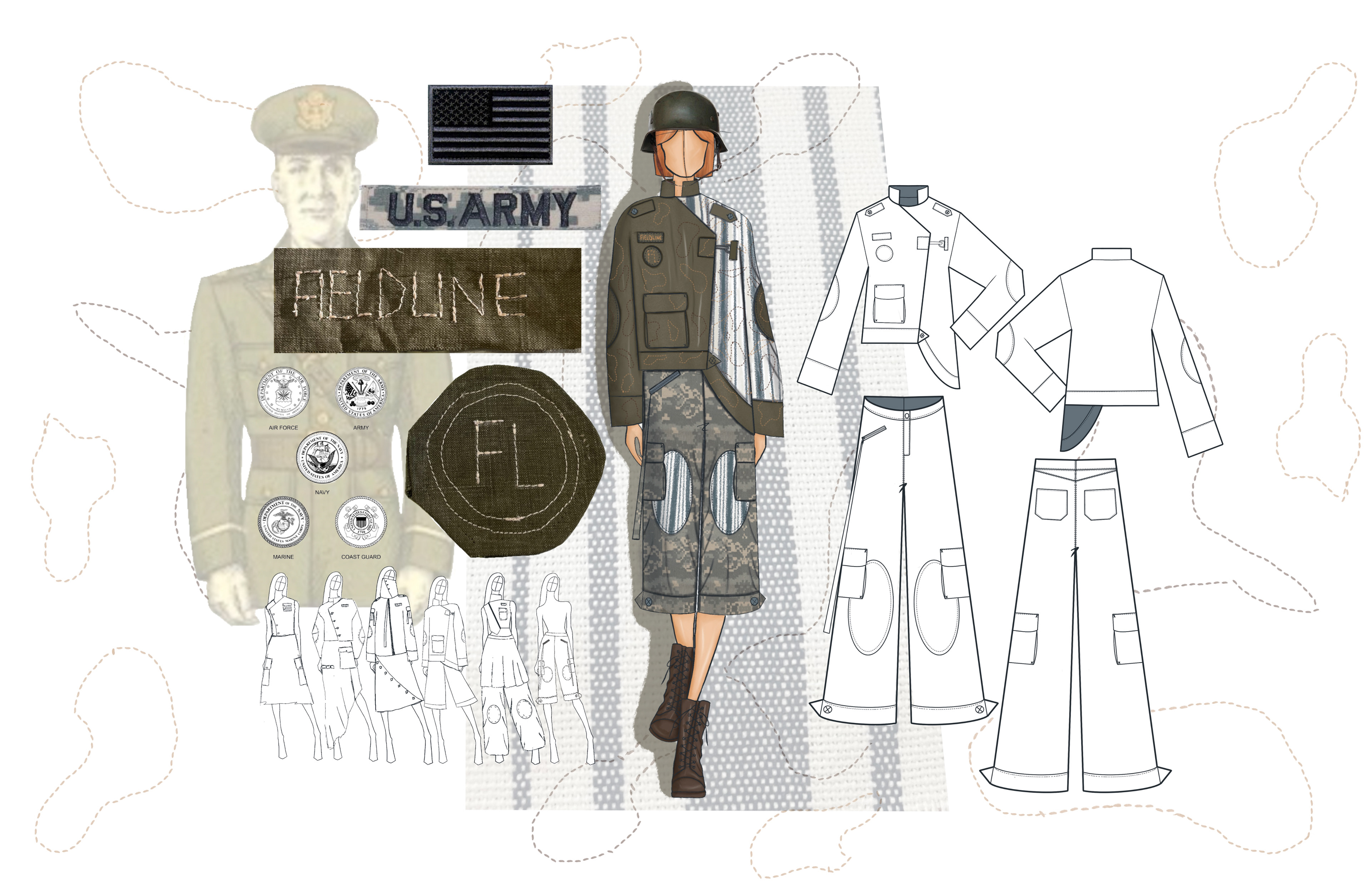 This collection explores military uniforms as its primary concept, focusing on utility, function, and durable construction details such as pockets, badges, and flat-felled seams. Inspired by both garments and military duffel bags, I sourced a vintage duffel, deconstructed it, and repurposed the fabric for samples and key pieces, incorporating authentic secondhand materials into the collection.