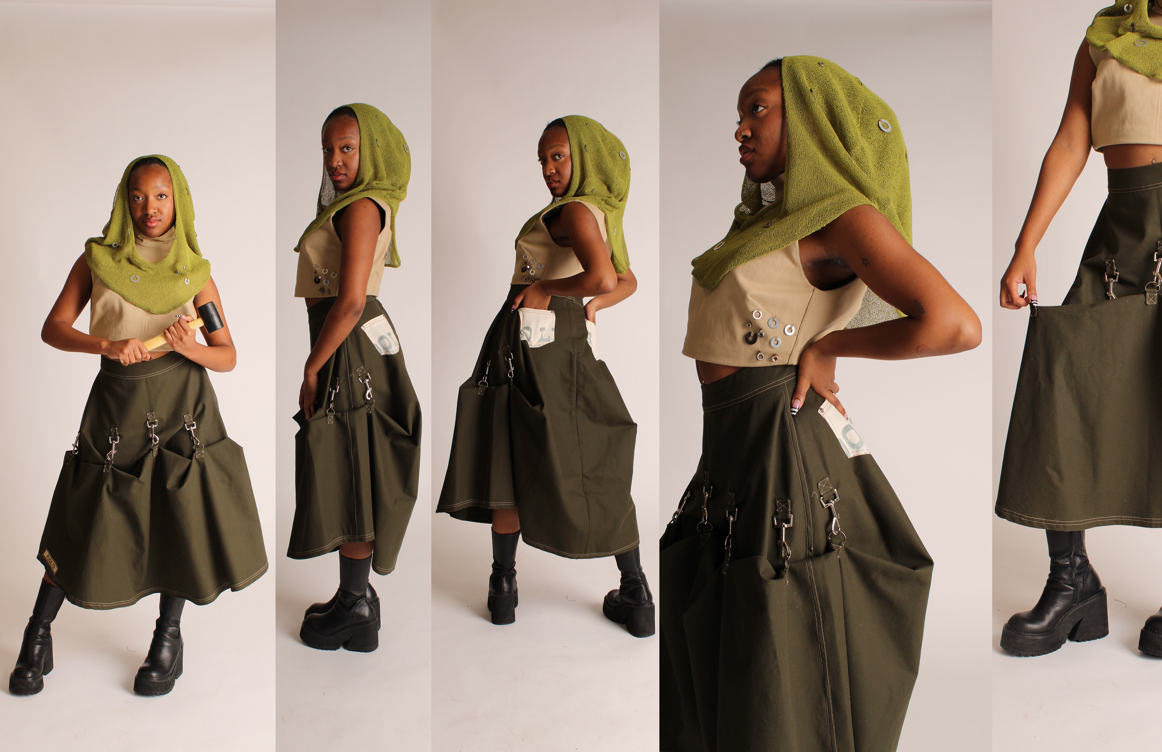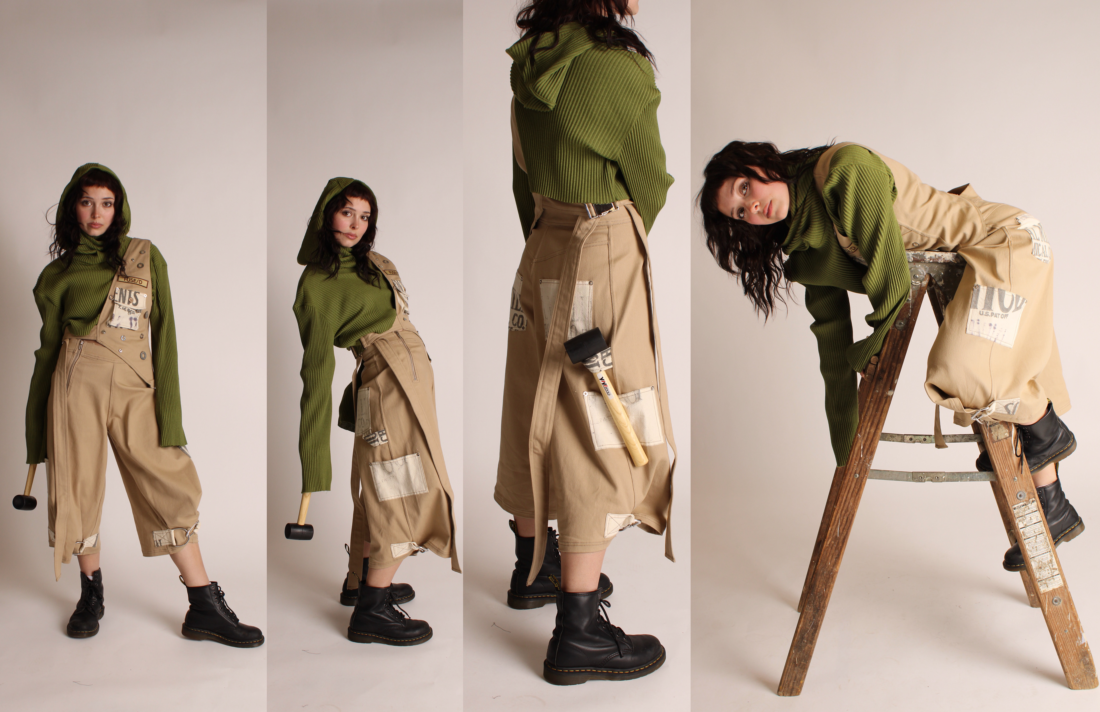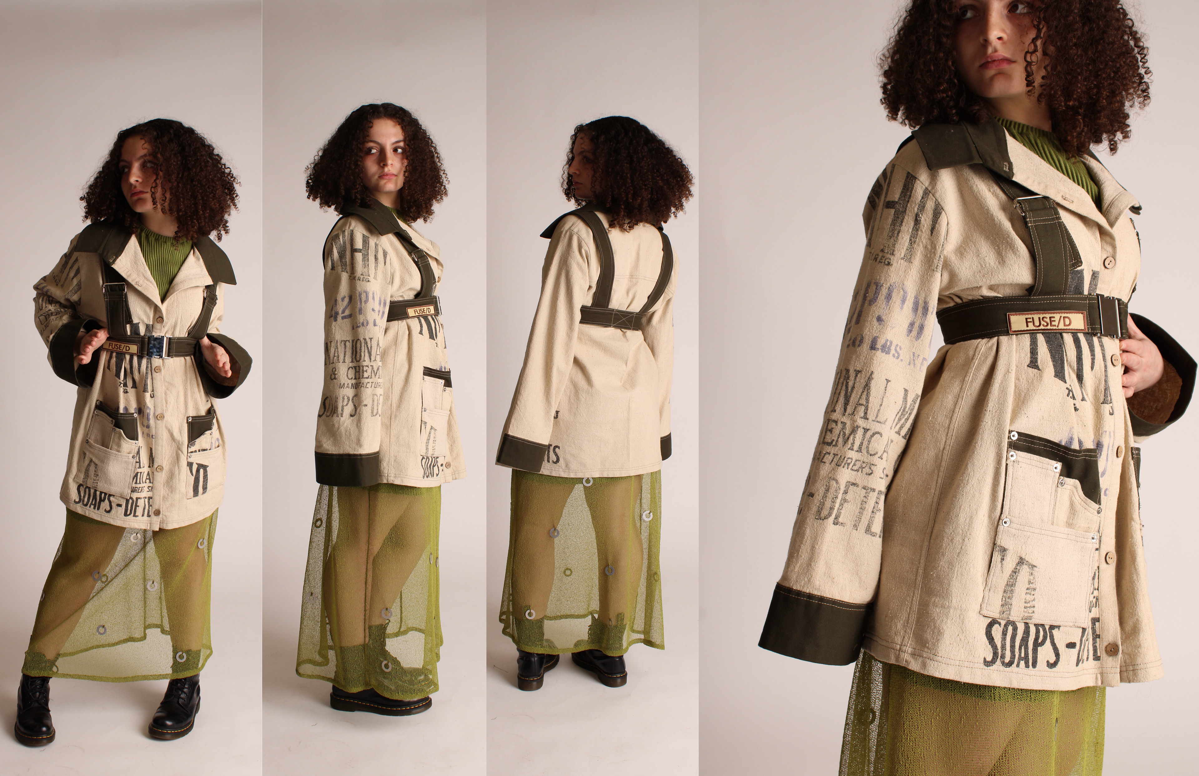 FUSE/D is a womenswear collection that aims to empower independence and confidence within women to ultimately challenge traditional gender stereotypes. This collection challenges the boundaries between traditional masculine workwear and feminine fashion, asking: how can the durability and functionality of men’s workwear be reinterpreted to complement the elegance of womenswear; to create a merge between two differing subjects? Traditionally men as positioned as most associated with workwear. Research into men’s workwear informed silhouettes and construction details such as flat felled seams, rivets, and double knee details, all reimagined into an empowering contemporary womenswear collection. Fabrication balances strength and femininity through twills, canvas, lightweight knits and vintage feed sacks. The feed sacks in this collection are sustainably sourced, referencing women’s historical practices of repurposing and labor.