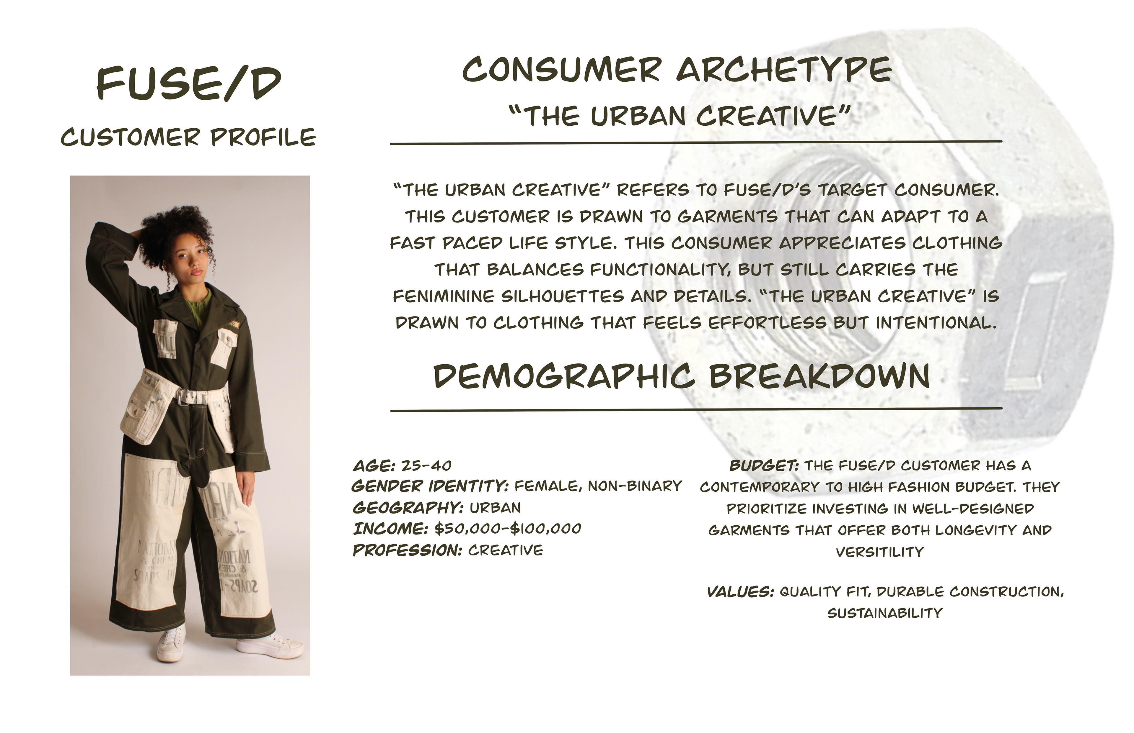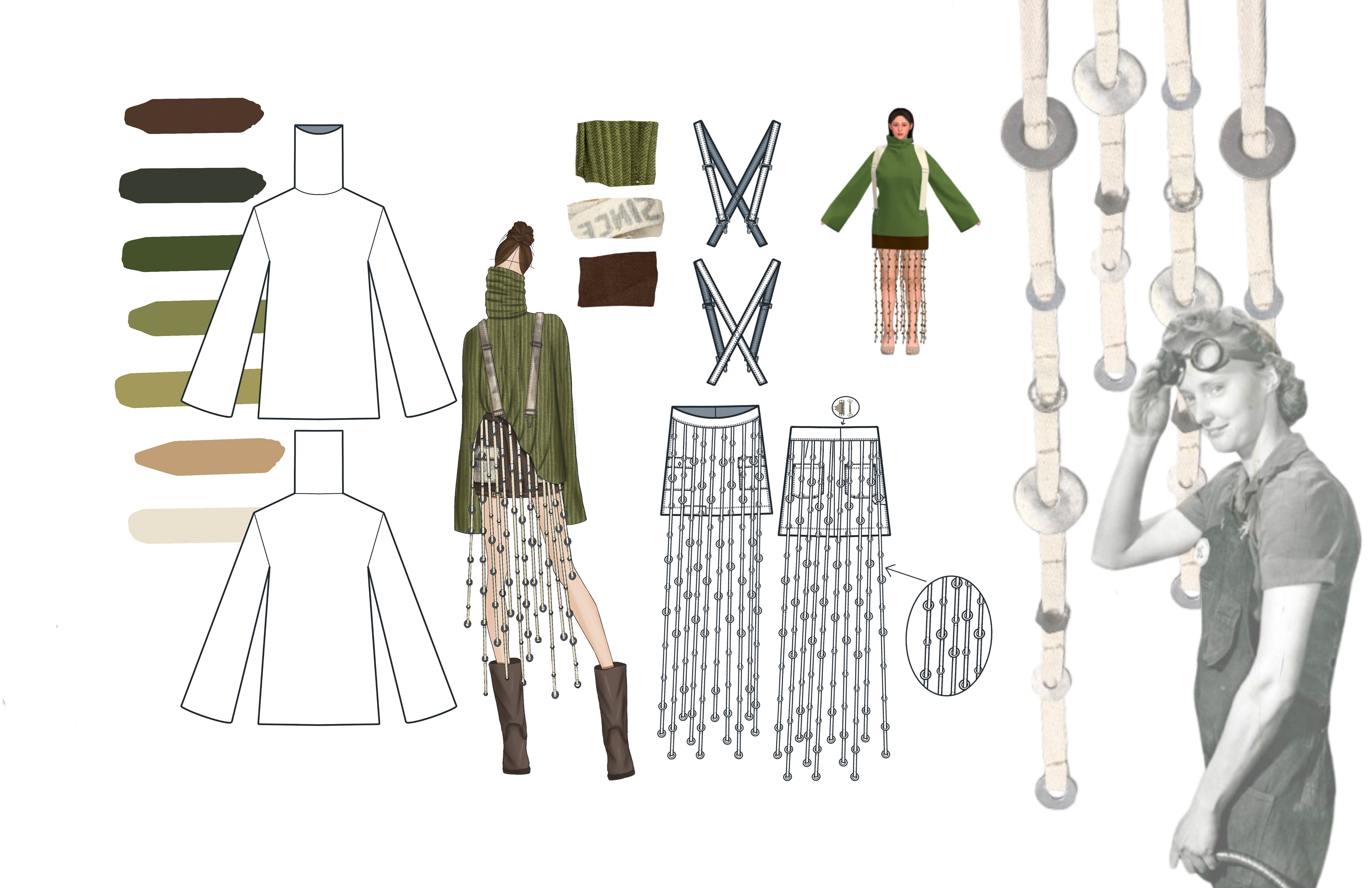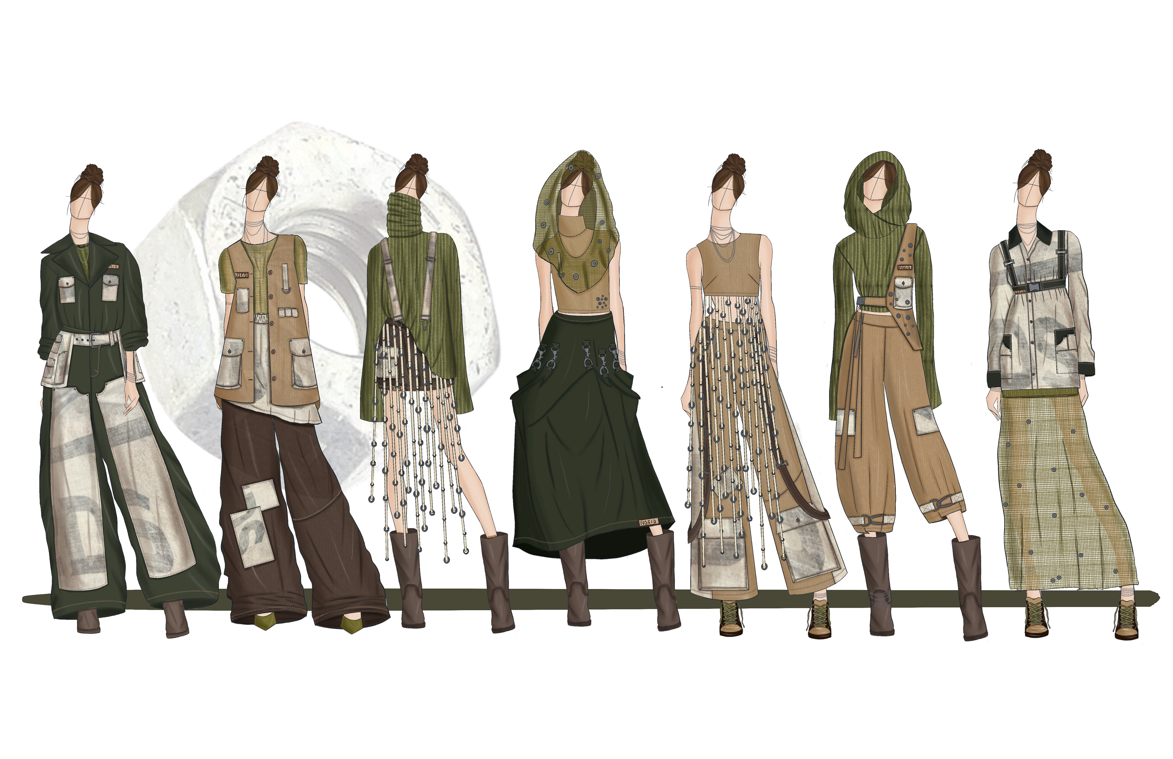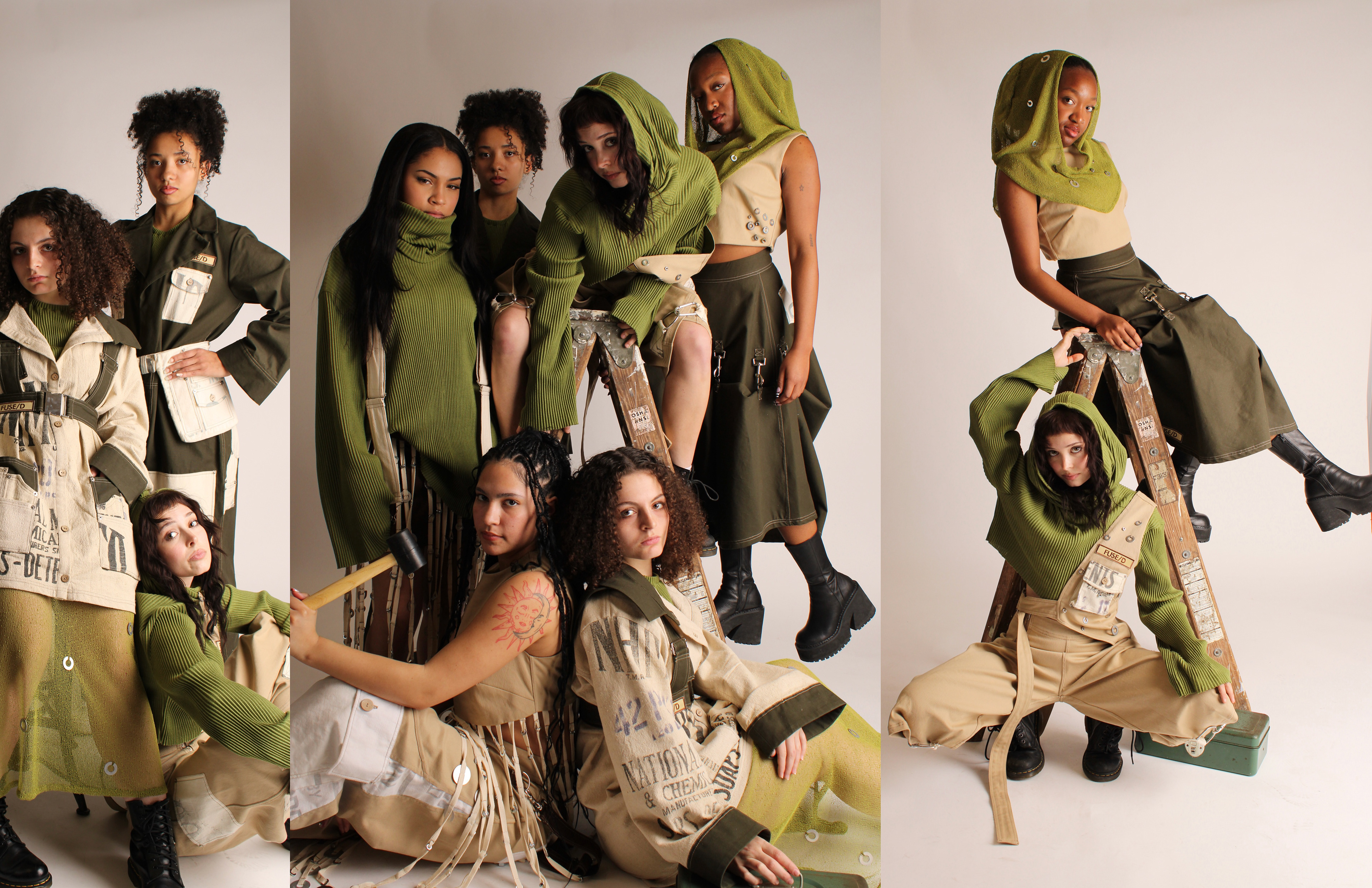 FUSE/D is a womenswear collection that aims to empower independence and confidence within women to ultimately challenge traditional gender stereotypes. This collection challenges the boundaries between traditional masculine workwear and feminine fashion, asking: how can the durability and functionality of men’s workwear be reinterpreted to complement the elegance of womenswear; to create a merge between two differing subjects? Traditionally men as positioned as most associated with workwear. Research into men’s workwear informed silhouettes and construction details such as flat felled seams, rivets, and double knee details, all reimagined into an empowering contemporary womenswear collection. Fabrication balances strength and femininity through twills, canvas, lightweight knits and vintage feed sacks. The feed sacks in this collection are sustainably sourced, referencing women’s historical practices of repurposing and labor.