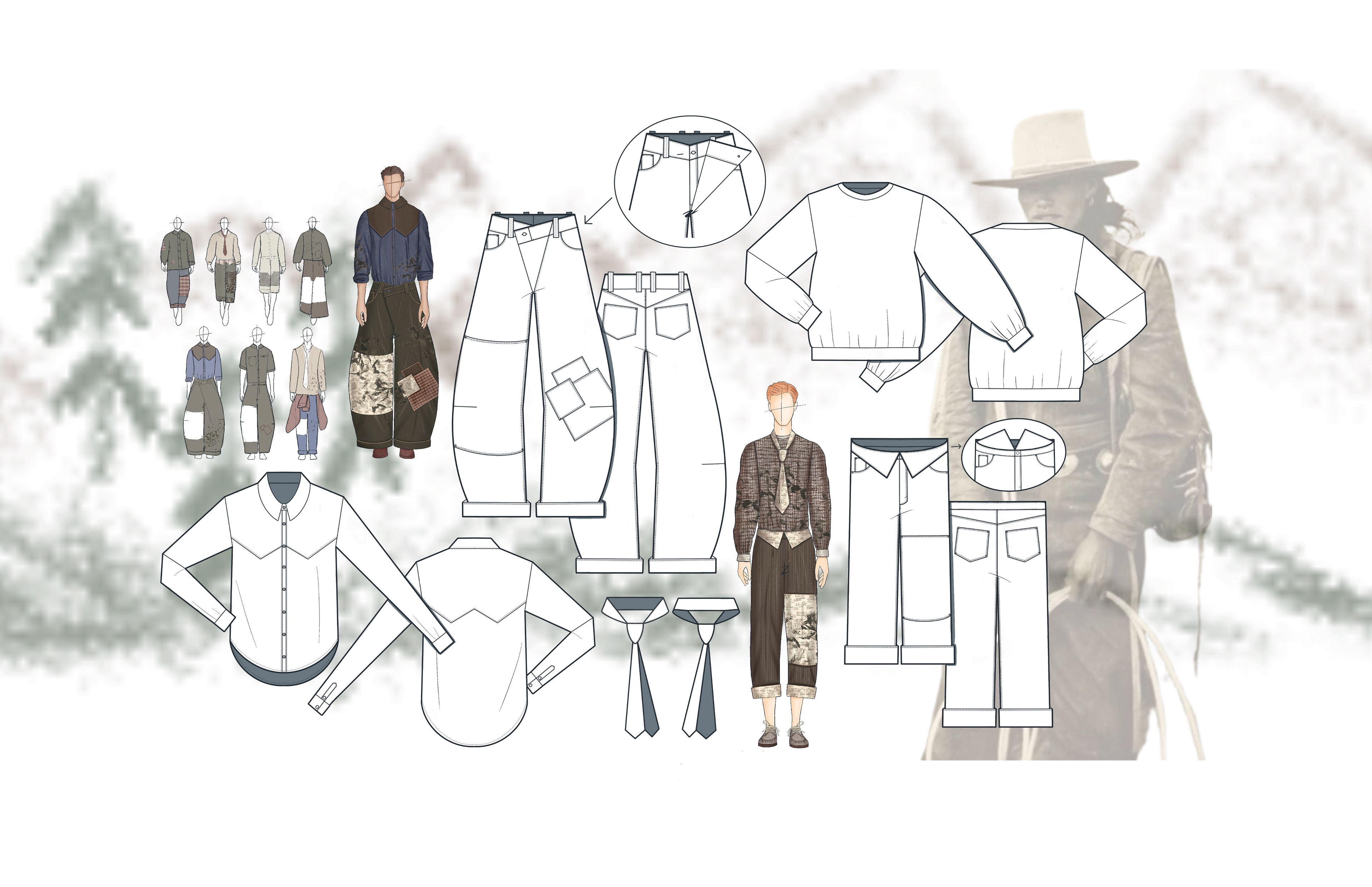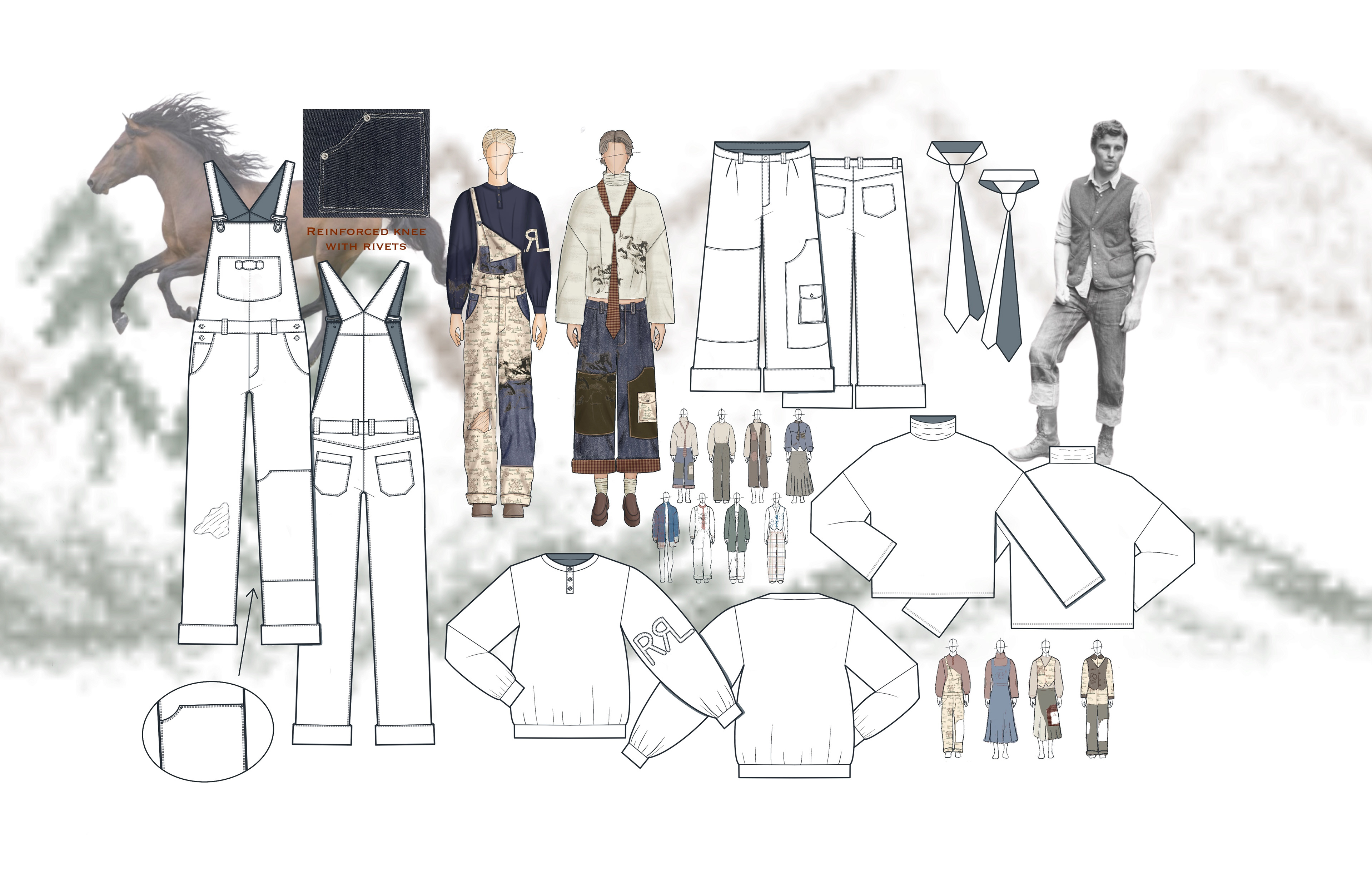 This project features a menswear collection designed for Ralph Lauren’s RRL brand, drawing inspiration from Western ranch wear and traditional American workwear. The collection explores heritage silhouettes, durable fabrications, and utilitarian detailing, reinterpreted through a contemporary lens while honoring RRL’s vintage identity.